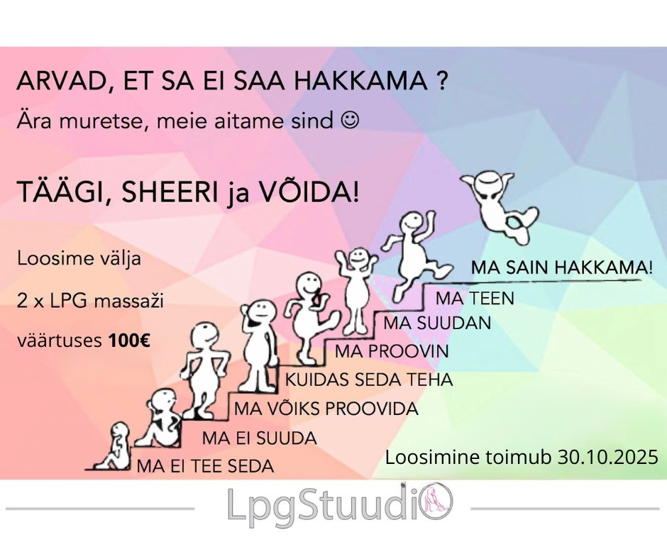 Lpg massaaži LOOS!! 13. okt. 2025 | Kommentaare pole Täägi, Sheeri ja Võida Meie usume, et Sa saad hakkama! Selleks, et saaksid tunda end kergemana, siledamana ja ilusamana, loosime välja 2 x LPG massaaži (väärtuses 100 €) Jaga seda postitust Järgi meid Facebook’is Täägi sõbrad, kes motiveerivad sind ja on abiks sinu teekonnal tervislikuma elu poole Loosimine toimub 30.10.2025. Head loosiõnne! https://www.facebook.com/photo?fbid=1378742134255922&set=a.482640300532781 Jaga seda: Click to share on X (Opens in new window) X Click to share on Facebook (Opens in new window) Facebook Related Categories: Postitused